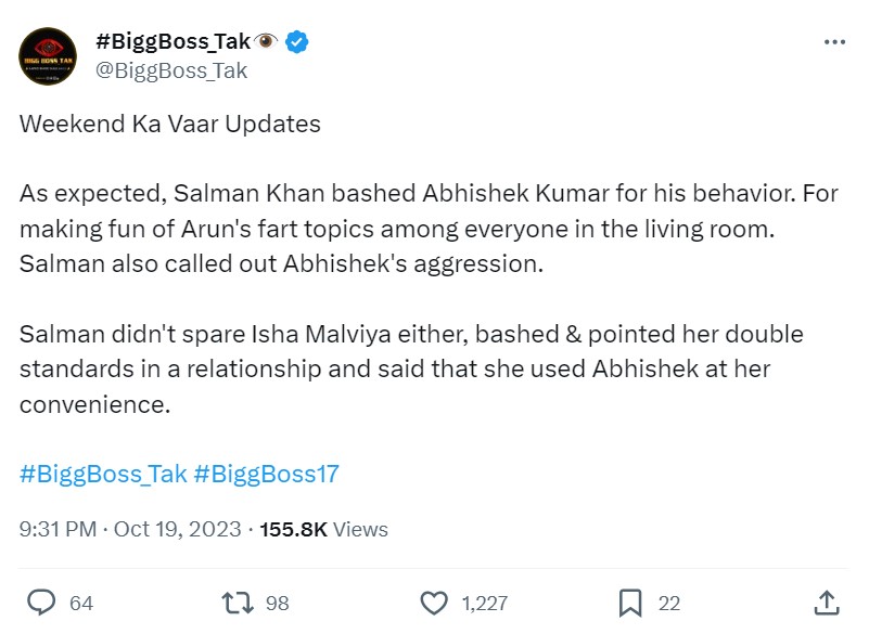 बिग बॉस 17 में अपने खराब रवैये के लिए सबसे ज्यादा चर्चा अभिषेक कुमार और ईशा मालवीय ने बटोरी है। अब वीकेंड का वार में सलमान खान ने भी दोनों को आड़े हाथ लिया। होस्ट का गुस्सा अभिषेक पर फूट गया। सलमान ने अरूण के फार्ट का मुद्दा बनाने और उसका मजाक उड़ाने पर खूब सुनाया। उन्होंने अभिषेक के गुस्से पर भी रिएक्ट किया। अभिषेक कुमार के बाद सलमान खान ने ईशा मालविया को भी लताड़ा। उन्होंने ईशा को डबल स्टैंडर्ड बताया और आरोप लगाया कि वो अभिषेक का अपने हिसाब से इस्तेमाल करती हैं।
