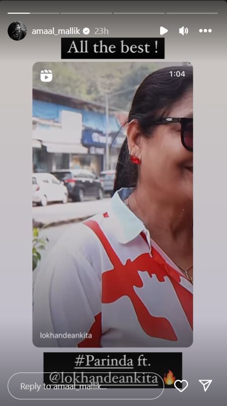 उन्होंने अपने आधिकारिक इंस्टाग्राम पर एक स्टोरी शेयर की है। इस वीडियो में अंकिता लोखंडे के साथ-साथ उनकी मम्मी भी हैं। इस वीडियो को शेयर करने के साथ ही अमाल मलिक ने कैप्शन में लिखा, "ऑल द बेस्ट", परिंदा..अंकिता लोखंडे"।