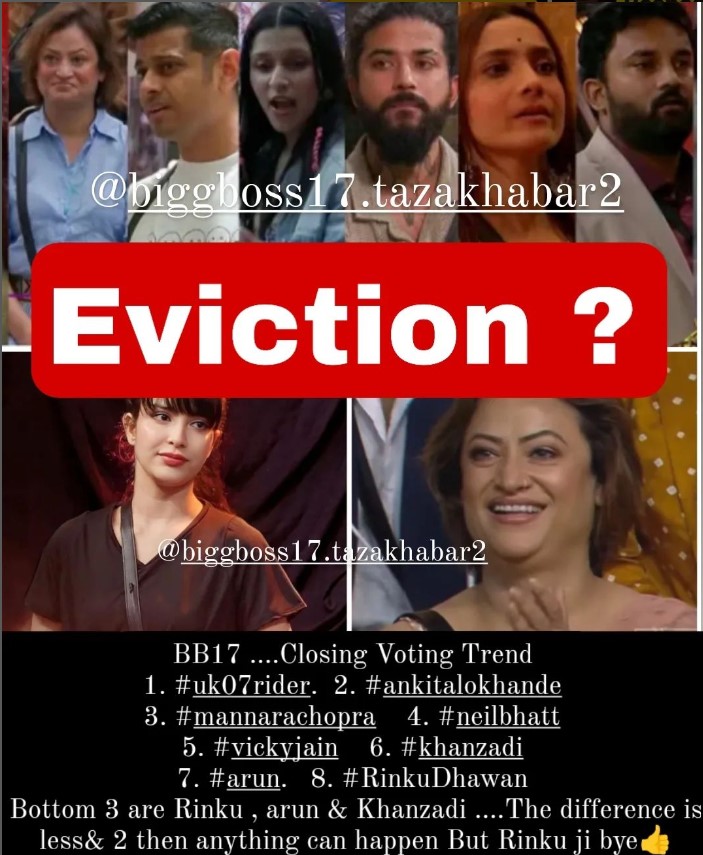 बिग बॉस 17 में इस हफ्ते आठ खिलाड़ी नॉमिनेट हुए हैं। इनमें रिंकू धवन, विक्की जैन, खानजादी, अंकिता लोखंडे, नील भट्ट, मन्नारा चोपड़ा, अनुराग डोभाल और अरुण श्रीकांत मशेट्टी का नाम शामिल है। लेटेस्ट वोटिंग ट्रेंड की माने तो सबसे कम वोट रिंकू, अरुण और खानजादी को मिले है। बिग बॉस 17 से इस हफ्ते एलिमिनेट होने के सबसे ज्यादा चांस रिंकू धवन के है।