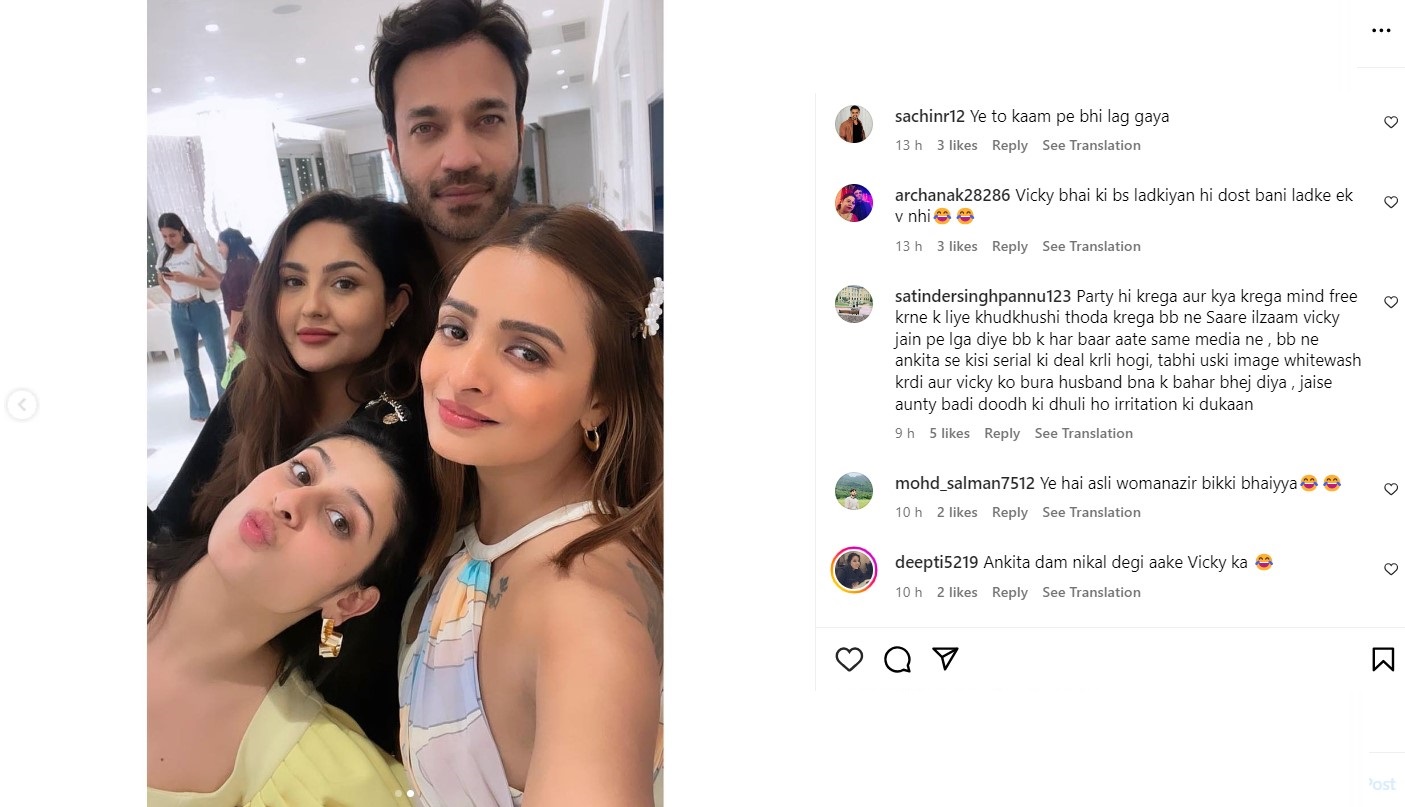 विक्की जैन की तस्वीरों पर कई सोशल मीडिया यूजर्स ने कमेंट भी किए। एक यूजर ने कहा, "विक्की भाई की बस लड़कियां ही दोस्त बनी, लड़के एक भी नहीं।" एक अन्य यूजर ने मजाक करते हुए कहा, "अंकिता दम निकाल देगी विक्की का।" विक्की के एलिमिनेशन को लेकर बात करते हुए एक यूजर ने कहा, "पार्टी करने लगा इतनी जल्दी, बीवी रो रही तभी, पार्टी मत करना।"