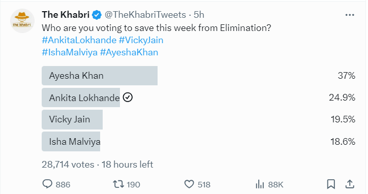 द खबरी के ट्विटर वोटिंग ट्रेंड के अनुसार फैंस इस हफ्ते वाइल्ड कार्ड एंट्री आयशा खान को नॉमिनेशन से सुरक्षित करना चाहते हैं। आयशा खान को सुरक्षित करने के 34 % लोगों ने वोटिंग की है, जो अंकिता लोखंडे, विक्की जैन और आयशा खान से कई ज्यादा है।