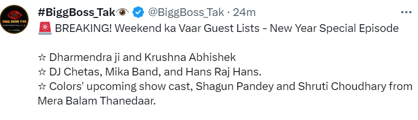 सोशल मीडिया हैंडल एक्स पर बिग बॉस तक नाम के एक अकाउंट ने इस बात की जानकारी दी कि इस बार वीकेंड का वार में दिग्गज अभिनेता धर्मेंद्र नजर आने वाले हैं। बता दें कि धर्मेंद्र लगभग तीन सालों से इस शो में मेहमान बनकर आ रहे हैं। धर्मेंद्र के साथ कृष्णा अभिषेक भी शो में दिखाई दे सकते हैं।