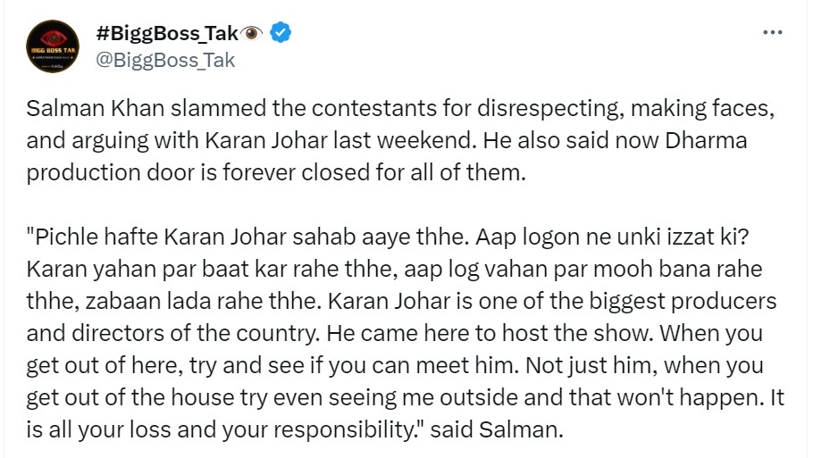 इस मामले को लेकर अब सलमान खान ने घरवालों को फटकार लगाई है। बिग बॉस खबरी तक की रिपोर्ट के अनुसार सलमान खान ने कहा- ''पिछले हफ्ते करण जौहर आए थे। आप लोगों ने उनकी इज्जत नहीं की। करण यहां पर बात कर रहे थे और आप लोग वहां पर मुंह बना रहे थे। जुबान लड़ा रहे थे। आपको पता है कि करण जौहर बॉलीवुड इंडस्ट्री और देश के सबसे बड़े प्रोड्यूसर और डायरेक्टर्स में से एक हैं।