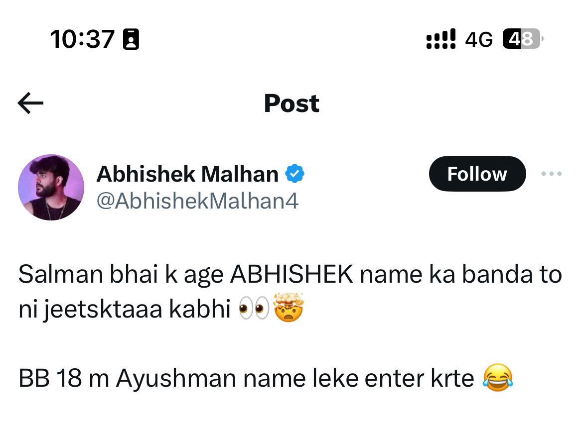 उन्होंने अपने आधिकारिक ट्विटर अकाउंट पर दबंग खान का नाम लिए बिना ही ताना कसते हुए लिखा, "सलमान भाई के आगे अभिषेक नाम के बंदे तो नहीं जीत सकते कभी। बिग बॉस 18 में आयुष्मान नाम लेकर एंटर करते"।