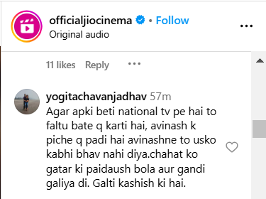 दूसरे यूजर ने लिखा, "अगर आपकी बेटी नेशनल टीवी पर है तो वह फालतू की बातें क्यों करती है। अविनाश के पीछे क्यों पड़ी थी, उसने तो कभी कशिश को भाव ही नहीं दिया। चाहत को गटर की पैदाइश बोला और गंदी गालिया दीं। आपकी बेटी गलत है"। एक और अन्य यूजर ने लिखा, "ये फैमिली वीक कम, अविनाश मिश्रा वीक ज्यादा लग रहा है"।