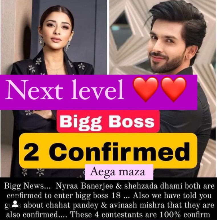 बिग बॉस 18 के कंटेस्टेंट के नामों की लिस्ट में अब एक नाम और जुड़ गया है, जो है टीवी की पिशाचिनी नायरा बनर्जी का। बिग बॉस 18 के खबरी पेज ने अपने इंस्टाग्राम पेज पर जानकारी शेयर करते हुए बताया कि नायरा बनर्जी का नाम सलमान खान के विवादित शो के लिए लगभग कन्फर्म हो चुका है। आपको बता दें कि इससे पहले नायरा बनर्जी खतरों के खिलाड़ी के 13वें सीजन में आ चुकी हैं।