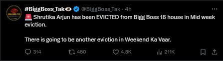 बिग बॉस की हर खबर पर पैनी नजर बनाए रखने वाले एक खबरी पेज ने अपने आधिकारिक एक्स अकाउंट पर जानकारी शेयर करते हुए बताया कि श्रुतिका अर्जुन कम वोट्स मिलने के कारण मिड वीक में शो से एलिमिनेट हो गई हैं।