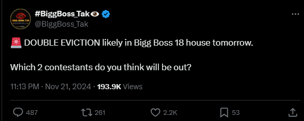 बिग बॉस 18 तक ने अपने एक्स अकाउंट पर एलिमिनेशन की जानकारी शेयर करते हुए बताया है कि इस हफ्ते शो में डबल एविक्शन होने वाला है। एक कंटेस्टेंट शो से शनिवार और एक रविवार को आउट हो सकता है। उन्होंने कौन से दो कंटेस्टेंट आउट होंगे ये नहीं बताया, लेकिन ऑडियंस के अंदाजे के मुताबिक, इस हफ्ते शो से एलिस कौशिक और कशिश कपूर शो से एलिमिनेट होंगे।