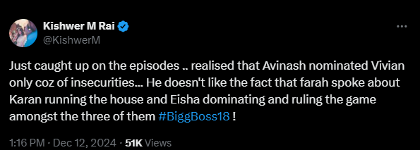 किश्वर ने अपने आधिकारिक एक्स अकाउंट अविनाश मिश्रा को लताड़ लगाते हुए लिखा, "मैंने अभी ये एपिसोड देखा है और मुझे इस बात का एहसास हुआ है कि अविनाश ने विवियन को सिर्फ अपनी इनसिक्योरिटी की वजह से नॉमिनेट किया है। उसे ये बात नहीं पसंद आई कि फराह ने बोला कि करण ये शो चला रहा है और ईशा सिंह उन दोनों को घुमा रही है।