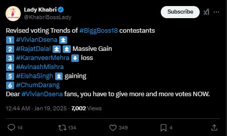 पहले नंबर पर शो के लाडले अपनी पकड़ बनाए हुए हैं। हालांकि विवियन और रजत के वोटों में काफी कम मार्जिन है जिसे देखकर कहा जा सकता है कि वो पहले नंबर पर भी आ सकते हैं। करणवीर अब तीसरे नंबर पर आ गए हैं, जबकि अविनाश मिश्रा, ईशा सिंह और चुम दरांग बॉटम 3 में नजर आ रहे हैं।