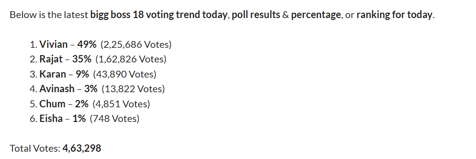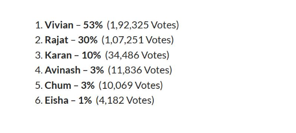 इसके अलावा दूसरे नंबर पर रजत दलाल चल रहे हैं, जिन्हें 35% परसेंट वोट्स मिले हैं, जोकि 1,62,826 हैं। इस वक्त जो लीड कर रहे हैं, वह बिग बॉस के लाडले विवियन डीसेना हैं, जिन्हें 49% पर्सेंट अब तक वोट्स मिले हैं। जो 2 लाख 25 हजार से ज्यादा हैं। सुबह तक विवियन और रजत के बीच 53% और 30% परसेंट का वोटिंग का डिफरेंस था, जो अब धीरे-धीरे कम हो रहा है। रजत और विवियन के बीच अब नेक टू नेक कॉम्पीटिशन है।