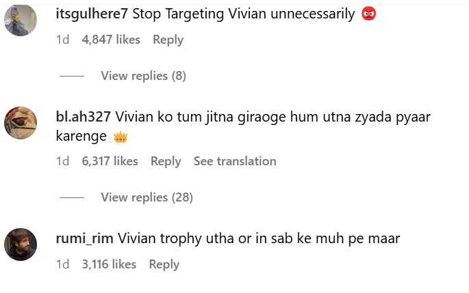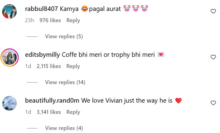 इस तरह से तमाम लोग विवियन के समर्थन में आगे आए हैं और काम्या को खूब सुना रहे हैं। इससे पहले बिग बॉस 9 के विनर रहे प्रिंस नेरूला ने भी काम्या के इस व्यवहार पर आपत्ति जताई है और विवियन डीसेना को टारगेट करने को लेकर नाराजगी व्यक्त की। जिसके चलते वह काम्या पंजाबी को ट्रोलिंग का सामना करना पड़ रहा है।