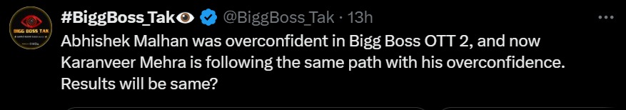 इस बीच बिग बॉस तक एक्स पेज ने करण के खेल की तुलना एक्स बिग बॉस ओटीटी 2 कंटेस्टेंट अभिषेक मल्हान के साथ कर दी है।