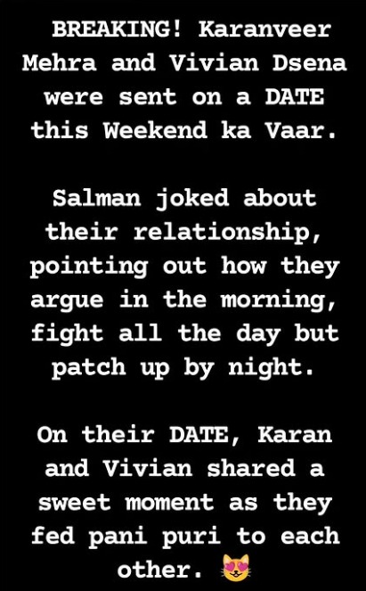इस पोस्ट में ये भी बताया गया कि करणवीर और विवियन दोनों ही अपनी डेट को काफी एन्जॉय करते नजर आए।उन्होंने एक-दूसरे पर खूब गोलगप्पे की बौछार की। आपको बता दें कि करणवीर मेहरा और विवियन डीसेना दोनों एक-दूसरे को पिछले 12 सालों से जानते हैं। वह साथ में फुटबॉल मैच भी खेलते हैं।