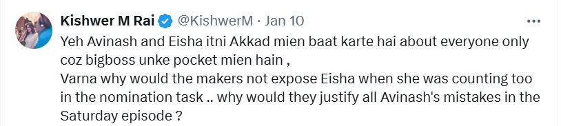 किश्वर मर्चेंट जिन दो कंटेस्टेंट्स को पसंद नहीं करती हैं, वो हैं अविनाश मिश्रा और ईशा सिंह। वह अक्सर अविनाश और ईशा का सपोर्ट लेने पर बिग बॉस की क्लास लगा चुकी हैं। हाल ही में, एक बार फिर उन्होंने बिग बॉस पर तंज कसते हुए अविनाश और ईशा की क्लास लगाई है। उन्होंने एक्स हैंडल पर लिखा, "ये अविनाश और ईशा सभी के बारे में अकड़ में बात करते हैं क्योंकि बिग बॉस उनकी जेब में हैं। वरना जब ईशा नॉमिनेशन टास्क में गिनती कर रही थी तो मेकर्स ने उनका पर्दाफाश क्यों नहीं किया। वे शनिवार के एपिसोड में अविनाश की सभी गलतियों को क्यों सही ठहराएंगे?"