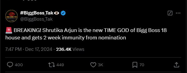 दरअसल, बिग बॉस से जुड़े अपडेट शेयर करने वाले एक्स अकाउंट बिग बॉस ने शो से जुड़े लेटेस्ट अपडेट में टाइम गॉड के नाम से पर्दा उठा दिया है। इस पोस्ट की मानें तो इस बार श्रुतिका अर्जुन घर की नई टाइम गॉड बन गई हैं। जी हां, आप में कई लोगों को जानकर हैरानी रही होगी मगर श्रुतिका अर्जुन ना सिर्फ नई टाइम गॉड बनी हैं बल्कि उन्हें दो हफ्ते तक नॉमिनेशन में सेफ रहने का आराम भी मिल गया है।