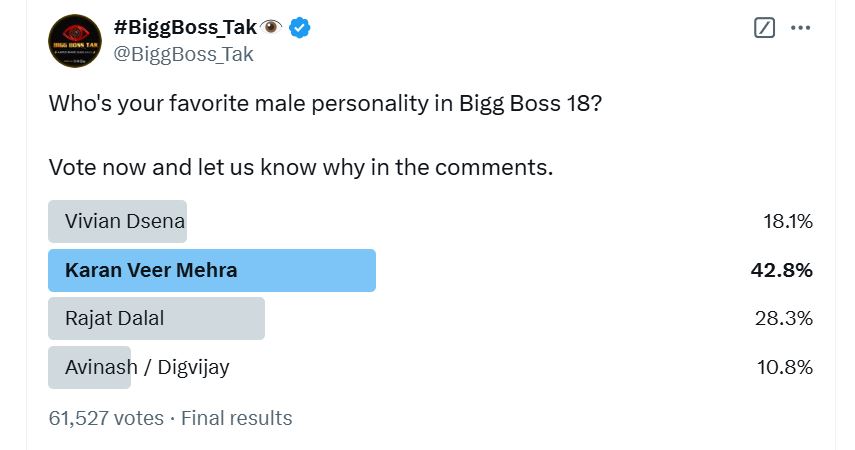 दरअसल, बिग बॉस तक नाम के एक एक्स पेज ने मोस्ट पॉपुलर बिग बॉस 18 कंटेस्टेंट का पोल शेयर किया है, जिसमें विवियन डीसेना, करणवीर मेहरा, रजत दलाल, अविनाश मिश्रा-दिग्विजय राठी हैं। इन पांचों में सबसे जिसको सबसे ज्यादा वोट मिले हैं, वो करणवीर मेहरा हैं। करण 42.8 प्रतिशत वोट मिले हैं, जबकि रजत को 28.3 प्रतिशत और विवियन को 18.1 प्रतिशत वोट मिले हैं। सबसे कम अविनाश-दिग्विजय को 10.8 प्रतिशत मिले हैं।