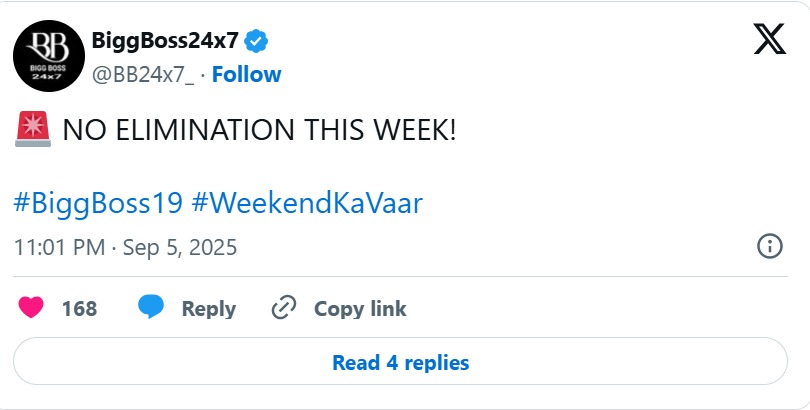 पहले हफ्ते में कोई भी कंटेस्टेंट घर से बेघर नहीं हुआ था और दूसरे हफ्ते में जो ट्विस्ट आने वाला है, वह भी ये ही है। बिग बॉस की हर खबर पर नजर रखने वाले एक एक्स अकाउंट ने ये बताया कि इस हफ्ते कोई भी कंटेस्टेंट शो से आउट नहीं होगा। यानी कि सलमान खान ये फैसला सुनाएंगे कि इस हफ्ते भी कोई एलिमिनेट नहीं हो रहा है। सलमान खान का ये फैसला जहां नॉमिनेटेड कंटेस्टेंट के लिए एक खुशी की बात है, तो वहीं कुछ घरवाले तो पक्का इस फैसले से निराश होने वाले हैं।