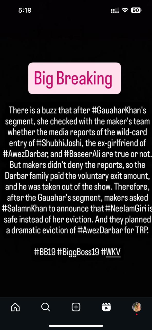अब बिग बॉस 19 की हर खबर देने वाले एक इंस्टाग्राम पेज ने बताया कि बसीर अली और आवेज दरबार को चीट करने वाली इन्फ्लुएंसर कोई और नहीं, बल्कि शुभी जोशी हैं, जो स्प्लिट्सविला में नजर आ चुकी हैं। रिपोर्ट में ये भी बताया गया कि गौहर ने मेकर्स से ये जानने की कोशिश की थी कि क्या वाकई शुभी बिग बॉस 19 में वाइल्ड कार्ड एंट्री बनकर आ रही हैं? जिस पर मेकर्स ने खबरों को झूठा नहीं बताया, जिस कारण आवेज दरबार के परिवार ने उनकी वोलेंटरी एग्जिट करवाई।