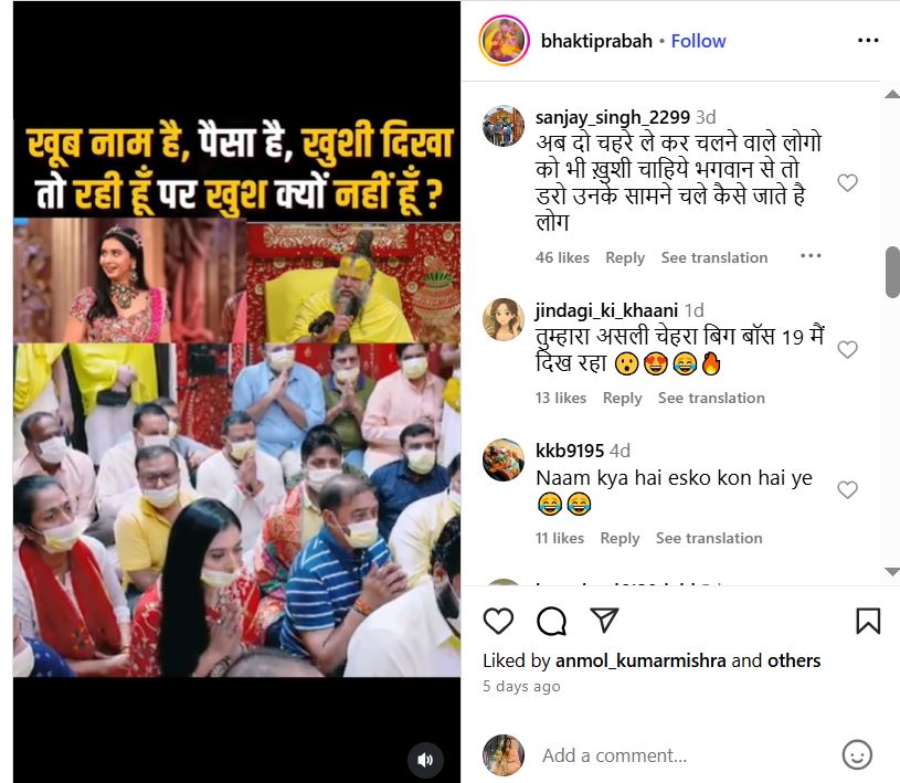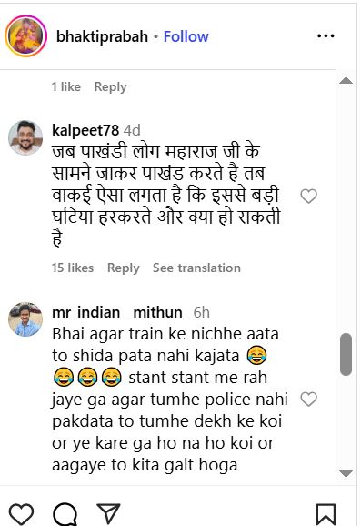 एक और अन्य यूजर ने लिखा, "जब पाखंडी लोग महाराज जी के सामने जाकर पाखंड करते है तब वाकई ऐसा लगता है कि इससे बड़ी घटिया हरकतें और क्या हो सकती है"। एक और यूजर ने लिखा, "अब दो चेहरे लेकर चलने वाले लोगो को भी खुशी चाहिए, भगवान से तो डरो उनके सामने चले कैसे जाते है लोग"।