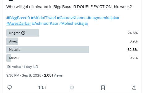 फिल्मी बीत की एक रिपोर्ट के मुताबिक, वोटिंग ट्रेंड के अनुसार जिन दो कंटेस्टेंट का इस हफ्ते सलमान खान के शो बिग बॉस 19 से पत्ता साफ हो सकता है, वह नगमा मिराजकर और नटालिया हैं। नटालिया को जहां शो से एविक्ट करने के लिए 62.8% लोगों ने वोट दिया है, तो वहीं नगमा के खिलाफ सोशल मीडिया पर 24.6% परसेंट लोगों ने वोट दिया है। मृदुल इस हफ्ते बिल्कुल सुरक्षित हैं।