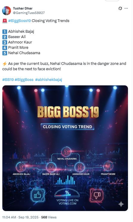 एक्स अकाउंट पर तुषार धर नाम के एक शख्स ने बिग बॉस की वोटिंग ट्रेंड लिस्ट शेयर की है, जिसमें अभिषेक बजाज और बसीर अली टॉप 2 हैं और स्टैंडअप कॉमेडियन प्रणित मोरे और नेहल बॉटम 2। अश्नूर कौर वोटिंग लिस्ट में तीसरे नंबर पर हैं।