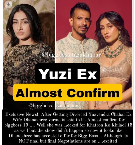 पेज पर किए गए दावों के मुताबिक, धनश्री का नाम इस शो के लिए लगभग फाइनल हो चुका है। वैसे वह खतरों के खिलाड़ी सीजन 15 में नजर आने वाली थीं, लेकिन वह शो नहीं बना और उन्होंने इस शो का ऑफर स्वीकार कर लिया है। ऐसा कहा जा रहा है कि अभी फिलहाल चैनल और एक्ट्रेस के बीच पैसों को लेकर नेगोसिएशन हो रही है। हालांकि, धनश्री की तरफ से बिग बॉस 19 का हिस्सा बनने पर कोई भी मुहर नहीं लगाई गई है।