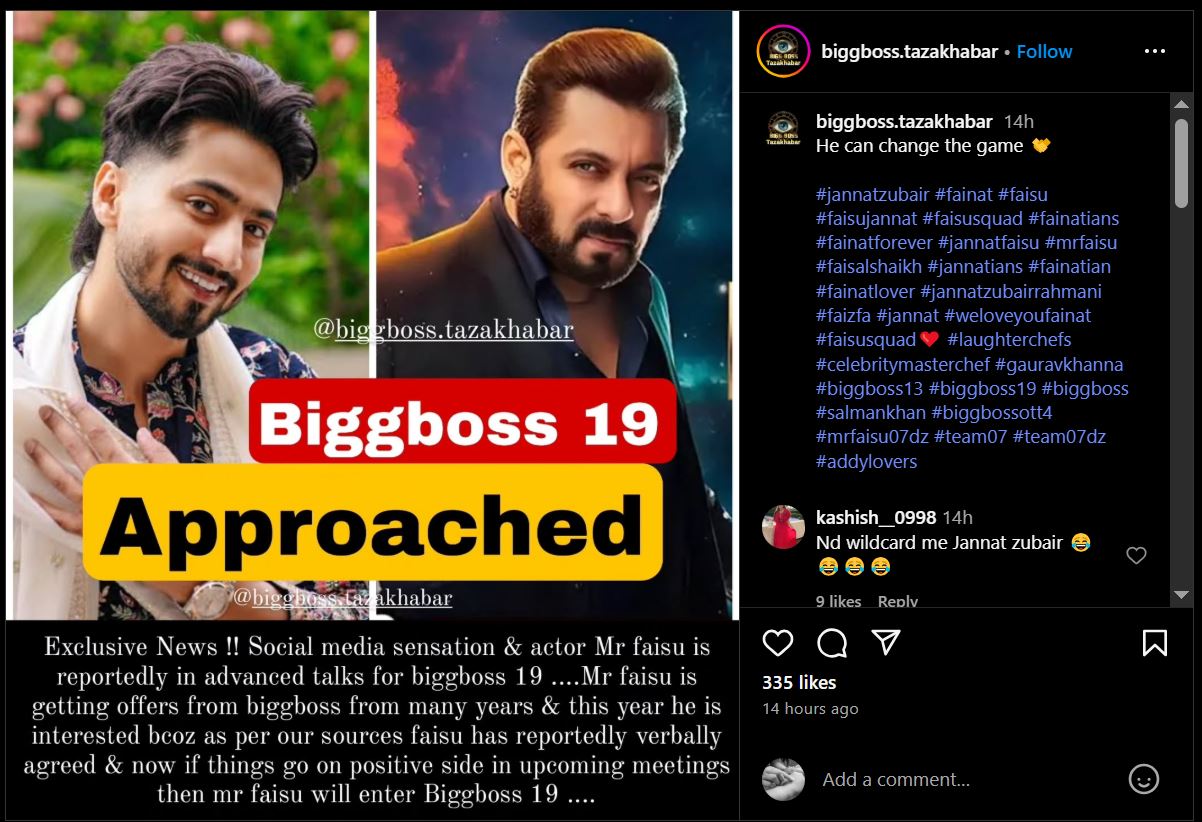 खबरों की मानें तो इस बार मिस्टर फैसु को फिर से ‘बिग बॉस 19’ के लिए अप्रोच किया गया है। इस बार वह शो में हिस्सा लेने के लिए उत्साहित भी दिख रहे हैं। सूत्रों के अनुसार, मिस्टर फैसु और मेकर्स के बीच बातचीत चल रही है, और उन्होंने शो में शामिल होने में रुचि दिखाई है। हालांकि, उन्होंने अभी तक कॉन्ट्रैक्ट साइन नहीं किया है। अगर सब ठीक रहा, तो फैंस उन्हें इस बार बिग बॉस के घर में देख सकते हैं।