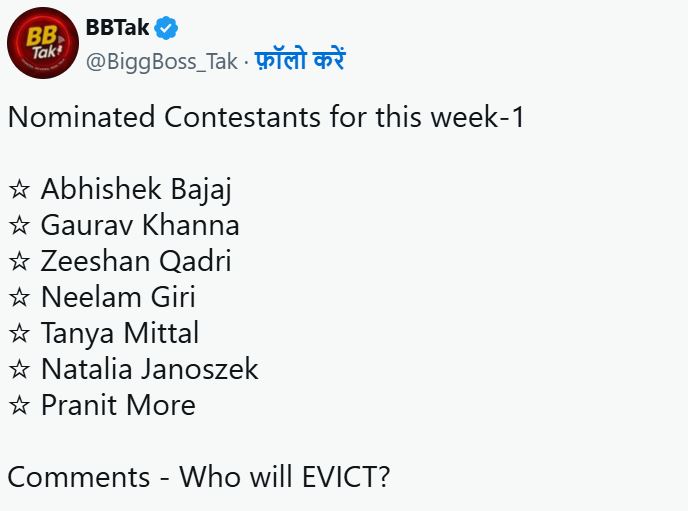 फरहाना भट्ट के सीक्रेट रूम में जाने के बाद इस हफ्ते जो कंटेस्टेंट घर से बेघर होने के लिए नॉमिनेट हुए हैं, उनमें तान्या भट्ट, गौरव खन्ना, नीलम, अभिषेक, नेहल, नैटेलिया जेनोस्जेक, जीशान कादरी और प्रणित मोरे है।