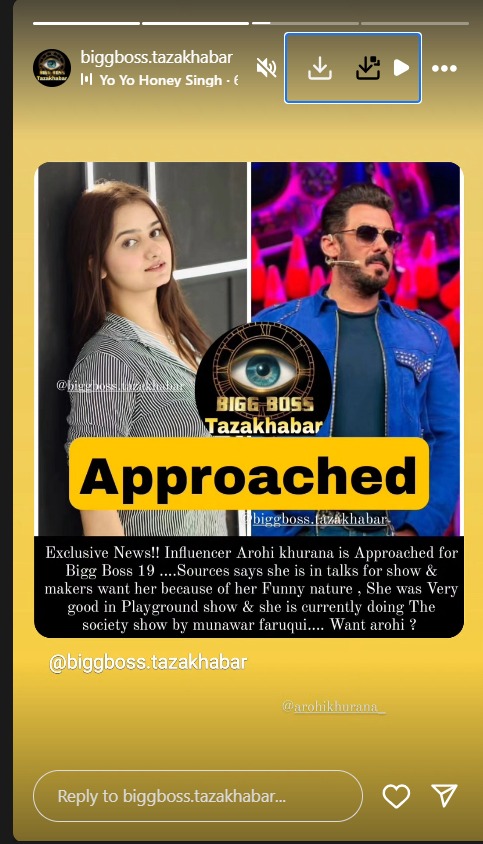 इन्फ्लुएंसर आरोही खुराना को सलमान खान के शो के लिए अप्रोच किया गया है। रिपोर्ट में बताया गया है कि अभी उनके साथ मेकर्स बातचीत कर रहे हैं। मेकर्स आरोही को उनके मजाकिया अंदाज और पॉपुलैरिटी के कारण शो में चाहते हैं।
