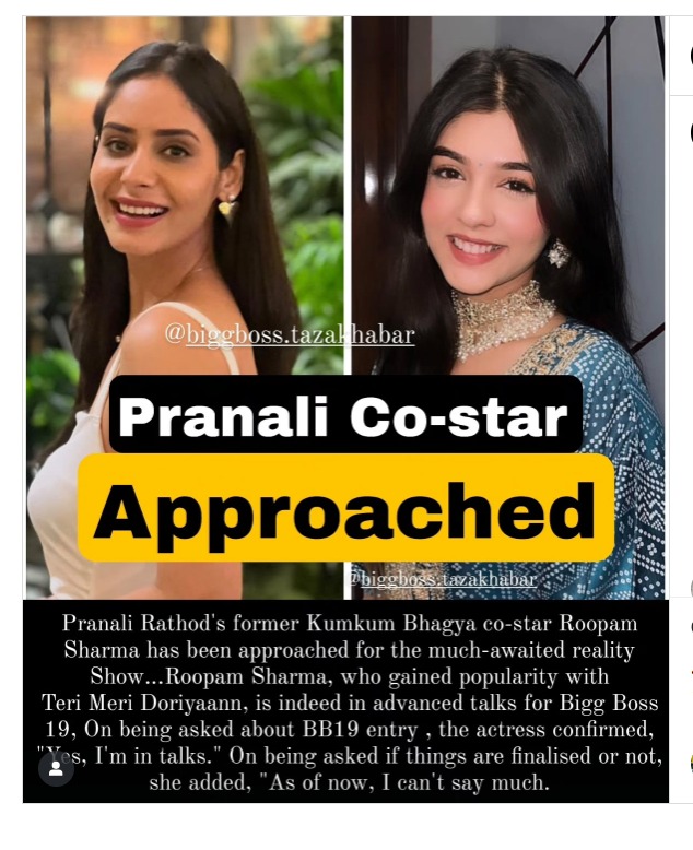 बिग बॉस के हालिया टीजरन ने दर्शकों के बीच धूम मचा दी है। इस बीच लोगों की एक्साइटमेंट लगातार बढ़ रही है, क्योंकि लगातार शो में शामिल होने वाले स्टार्स के नाम सामने आ रहे हैं। बिग बॉस ताजा खबर के इंस्टाग्राम पेज पर नई पोस्ट में बताया गया है कि प्रणाली राठौड़ की को-एक्ट्रेस रह चुकी अभिनेत्री रूपम शर्मा को मोस्ट अवेटेड शो का न्योता मिला है। उन्होंने कुमकुम भाग्य शो हाल ही मे छोड़ा है। इस वजह से भी अटकलें तेज हो गई हैं कि वह रियलिटी शो का हिस्सा बनने की तैयारी में हैं।