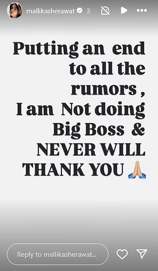 सोमवार को अपनी इंस्टाग्राम स्टोरी में मल्लिका शेरावत ने लिखा, 'सभी तरह की अफवाहों पर विराम लगा रही हूं। मैं बिग बॉस नहीं कर रही हूं और ना ही कभी इसे करने का इरादा है। शुक्रिया।'