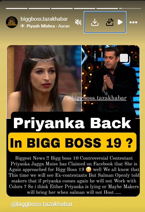 बिग बॉस ताजा खबर की एक पोस्ट में जानकारी दी गई है कि बिग बॉस 10 का हिस्सा रही विवादित कंटेस्टेंट प्रियंका जग्गा को एक बार फिर सलमान खान के शो का ऑफर मिला है। रिपोर्ट में बताया गया है कि प्रियंका ने खुद इस बात का दावा फेसबुक पर किया है कि उन्हें बिग बॉस 19 (Bigg Boss 19) का न्योता मिला है।