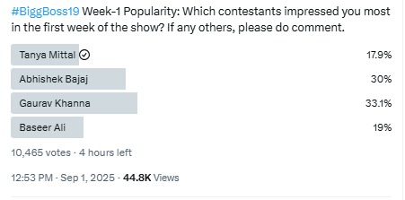 बीबी तक ने अपने एक्स अकाउंट पर पहले वीक का ऑडियंस पोल शेयर किया है, जिसमें किस कंटेस्टेंट का गेम उन्हें सबसे दिलचस्प लगा ये लिखा हुआ है। सबसे अच्छा गेम खेलने वालों की लिस्ट में तान्या मित्तल, अभिषेक बजाज, गौरव खन्ना और बसीर अली का नाम है। इस पोल में 33.1% लोगों ने गौरव खन्ना के गेम को इंट्रेस्टिंग बताया है। इसके बाद दूसरे नंबर पर अभिषेक बजाज है, जिसे 29% वोट्स मिले हैं।