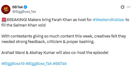 इस वीकेंड के वार में अक्षय कुमार (Akshay Kumar) और अरशद वारसी 'जॉली एलएलबी-3' का प्रमोशन करते हुए दिखाई देंगे। हालांकि, वह वीकेंड के वार को होस्ट नहीं करेंगे। वीकेंड के वार की होस्टिंग संभालेंगी वह बिग बॉस की जबरा फैन हैं। बिग बॉस तक ने अपने आधिकारिक एक्स अकाउंट पर जानकारी शेयर करते हुए बताया कि इस हफ्ते वीकेंड के वार में डायरेक्टर फराह खान सलमान की जगह लेंगी।