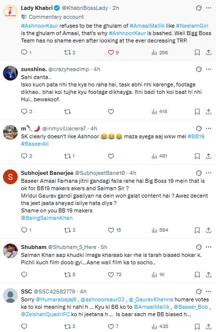 वहीं दूसरे यूजर ने अश्नूर को सपोर्ट करते हुए लिखा, "सलमान खान आप खुद की इमेज खराब कर रहे हो, इस तरह बायस्ड होकर, पिछली कुछ फिल्में डूब गईं। आने वाली का तो सोचो कम से कम"। एक अन्य यूजर ने लिखा, "सॉरी बजाज-गौरव और अश्नूर हमारे वोट्स के कोई मायने नहीं हैं, क्योंकि सलमान और मेकर्स अमाल-बसीर, शहबाज और जीशान को ही जिताएंगे"।