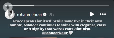 रोहन मेहरा ने अपने आधिकारिक इंस्टाग्राम अकाउंट पर एक स्टोरी पोस्ट की है, जिसमें उन्होंने अश्नूर का सपोर्ट करते हुए तान्या मित्तल के खिलाफ लिखा, "इंसान का ग्रेस अपने आप ही सबकुछ कह देता है। जहां कुछ लोग अपने ही सपनों में जी रहे हैं, तो वहीं अश्नूर अपनी शान, क्लास और गरिमा से चमकती रहती हैं, जिन्हें शब्दों में बिल्कुल भी बयां नहीं किया जा सकता है"।