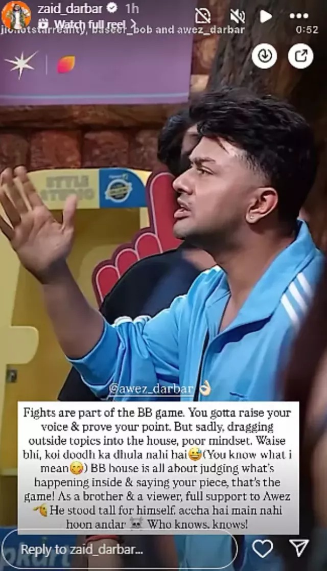 इसके अलावा, ज़ैद ने बताया कि बिग बॉस का खेल घर के अंदर के हालात को आंकने पर आधारित है। उन्होंने आगे कहा कि उनका समर्थन उनके भाई के लिए है। उन्होंने अपने नोट के अंत में लिखा- "बिग बॉस हाउस में अंदर क्या हो रहा है, इसका आकलन करना और अपनी बात कहना ही सब कुछ है; यही खेल है! एक भाई और एक दर्शक के तौर पर, आवेज़ को पूरा समर्थन। वह अपने लिए खड़ा रहा। अच्छा है मैं अंदर नहीं हूं। जो जानता है उसे पता है!"