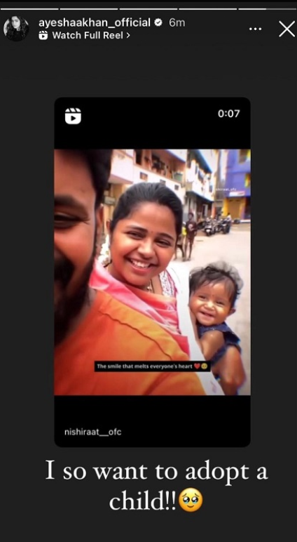 पति-पत्नी के अलावा उनके साथ एक छोटा बच्चा भी नजर आ रहा है। इस छोटे बच्चे की मासूमियत भरी मुस्कुराहट देखकर आयशा खान को उस पर प्यार लुटाने से नहीं रोक सकीं। उन्होंने इस फोटो को शेयर करते हुए लिखा, "मैं भी बच्चा अडॉप्ट करना चाहती हूं"।