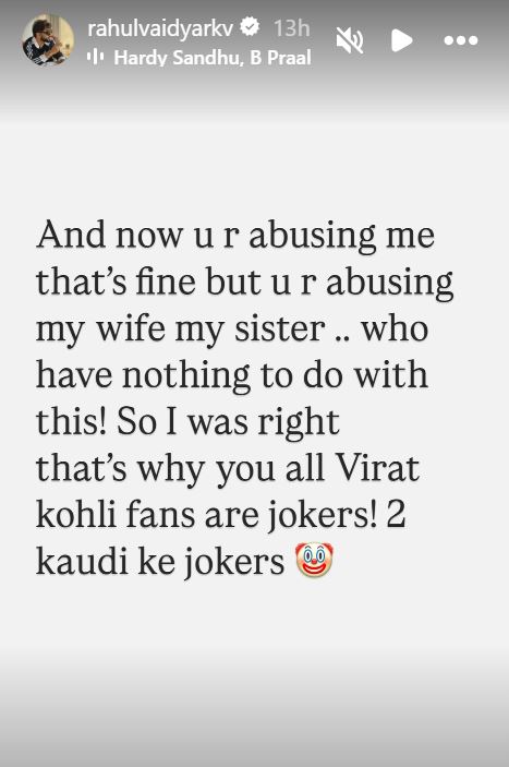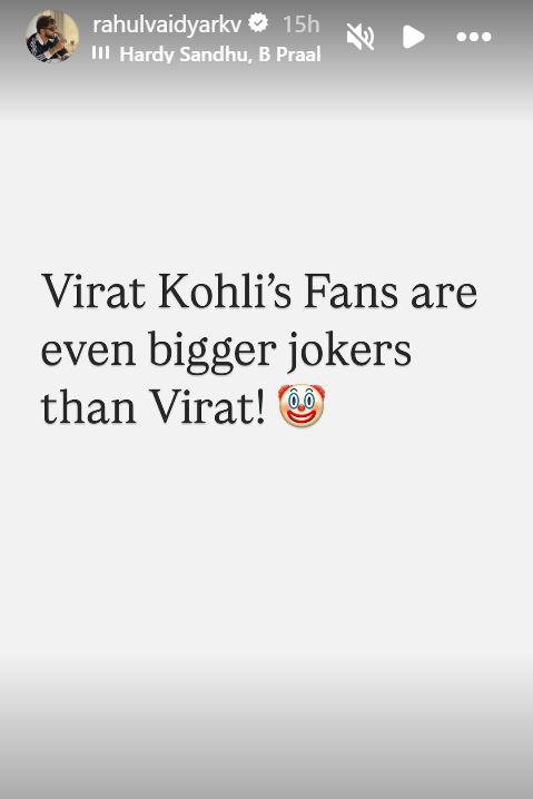 राहुल वैद्य ने इंस्टाग्राम स्टोरी में अपने हालिया पोस्ट में लिखा, "विराट से ज्यादा जोकर्स तो विराट कोहली के फैंस हैं।" राहुल यहीं नहीं रुके, उन्होंने एक और पोस्ट किया और बताया कि उन्हें और उनकी पत्नी-बहन को गालियां मिल रही हैं।