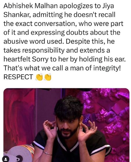 इस दौरान जिया ने अभिषेक पर आरोप लगाया कि फुकरा इंसान ने उन्हें गाली दी है। जिसके बाद अभिषेक ने जिया शंकर के पास आकर कान पकड़ कर उनसे माफी मांगते हुए कहा कि उन्हें पूरी बातचीत याद नहीं है, उन्हें ये सच में नहीं पता कि उन्होंने अभद्र शब्द का इस्तेमाल किया था या नहीं, लेकिन वह इसकी पूरी जिम्मेदारी लेते हैं और उनसे माफी मांगते हैं।