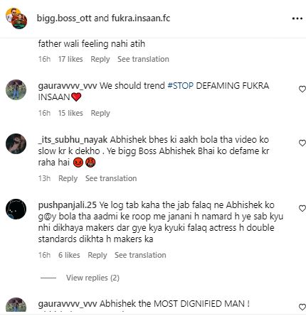 एक यूजर ने कमेंट करते हुए लिखा, "हमें स्टॉप डिफेमिंग फुकरा इंसान ट्रेंड चलाना चाहिए"। दूसरे यूजर ने लिखा, "अभिषेक ने गाली नहीं दी थी जिया को, उसने भैंस की आंख बोला था, आप वीडियो को स्लो करके चाहो तो देख सकते हो।