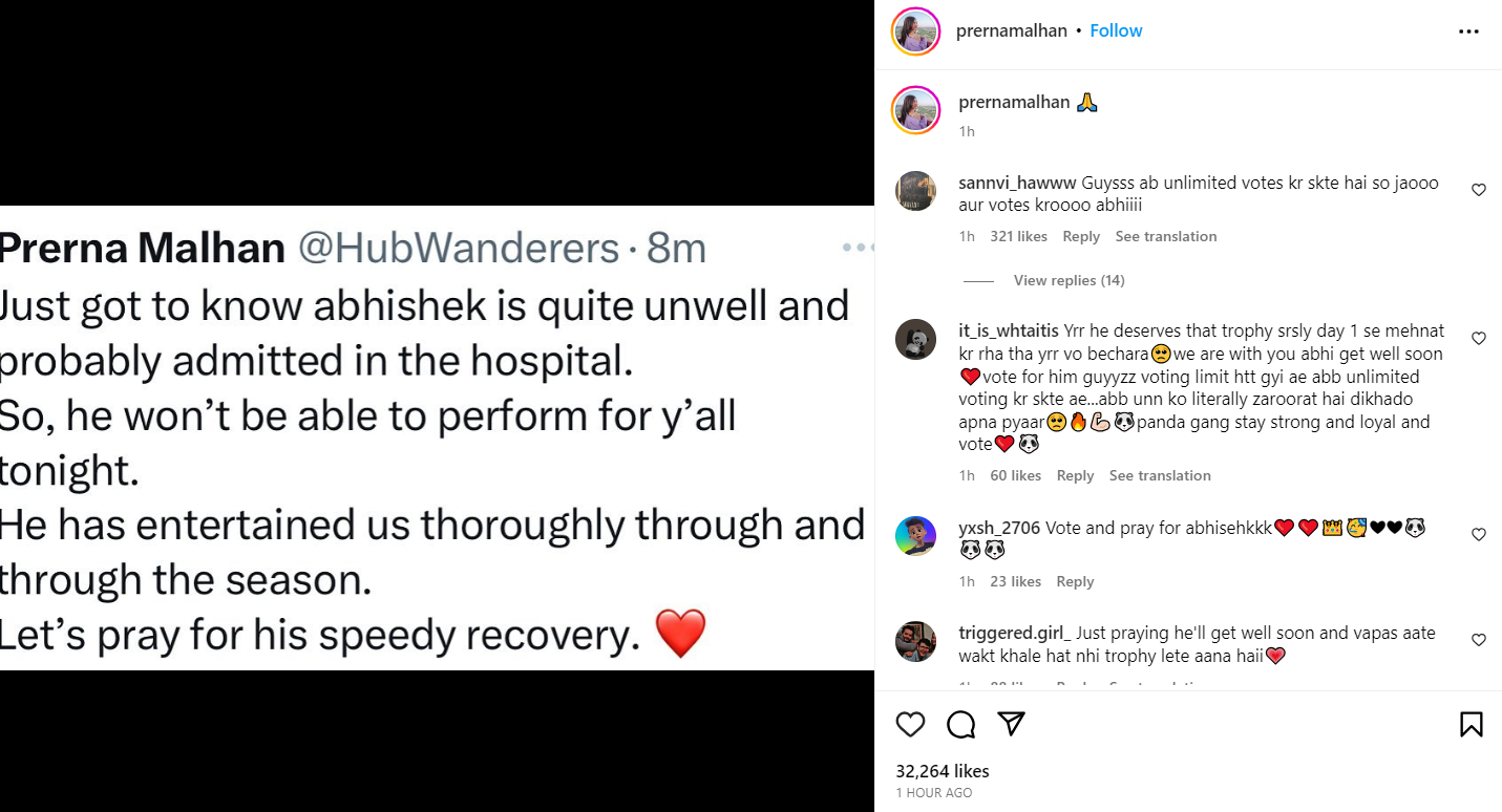 फुकरा की बहन प्रेरणा भी एक जानी-मानी यूट्यूबर है। उन्होंने कुछ ही देर पहले इस खबर को सोशल मीडिया पर साझ कि है। उन्होंने ट्वीट किया, अभी पता चला कि अभिषेक काफी अस्वस्थ हैं और शायद अस्पताल में भर्ती हैं। इसलिए, वह आज रात आप सभी के लिए प्रदर्शन नहीं कर पाएगा। उन्होंने पूरे सीजन में हमारा भरपूर मनोरंजन किया है। आइए उनके शीघ्र स्वस्थ होने के लिए प्रार्थना करें।