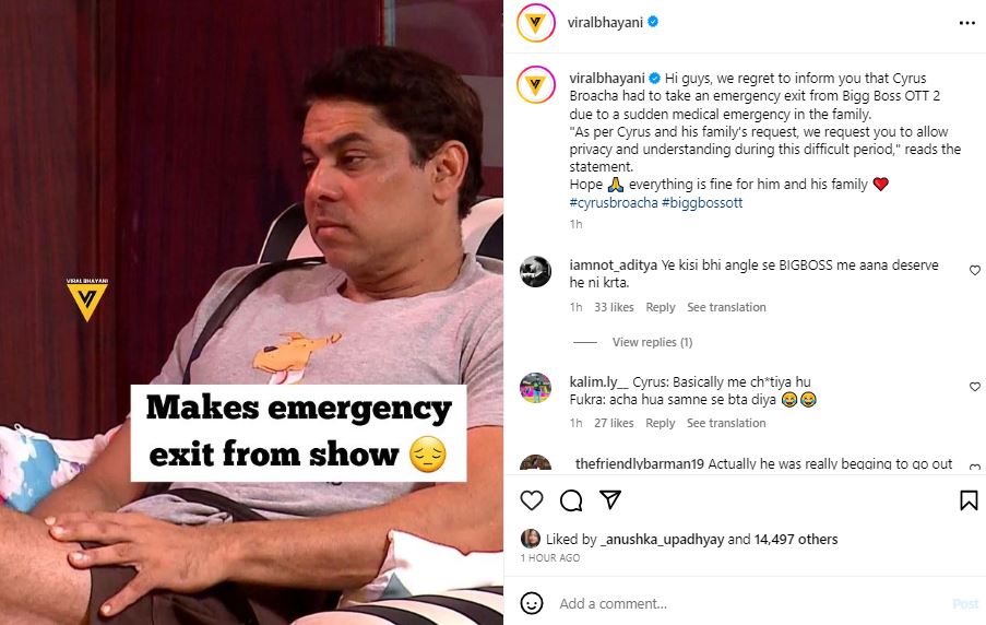 बिग बॉस के सेट से एक सूत्र ने कहा, "साइरस को परिवार में अचानक मेडिकल इमरजेंसी के कारण शो छोड़ना पड़ा"। इतना ही नहीं, उनके परिवार ने भी ये गुजारिश की कि इस मुश्किल घड़ी में उनके और उनके परिवार की प्राइवेसी का ध्यान रखा जाए"। हालांकि, ये बात अब तक क्लियर नहीं है कि साइरस ब्रोचा इस शो में वापस आएंगे या नहीं।