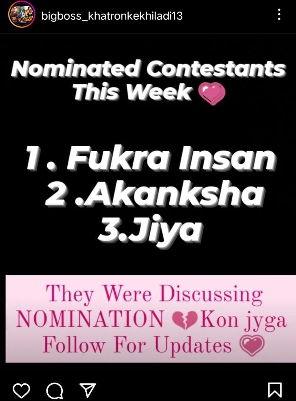 अब हाल ही में बिग बॉस खबरी ने अपने इंस्टाग्राम पेज पर ये जानकारी शेयर की कि तीसरे नॉमिनेशन के बाद अब फुकरा इंसान उर्फ अभिषेक मल्हान, जिया शंकर और आकांक्षा पुरी नॉमिनेशन में आ गए हैं।