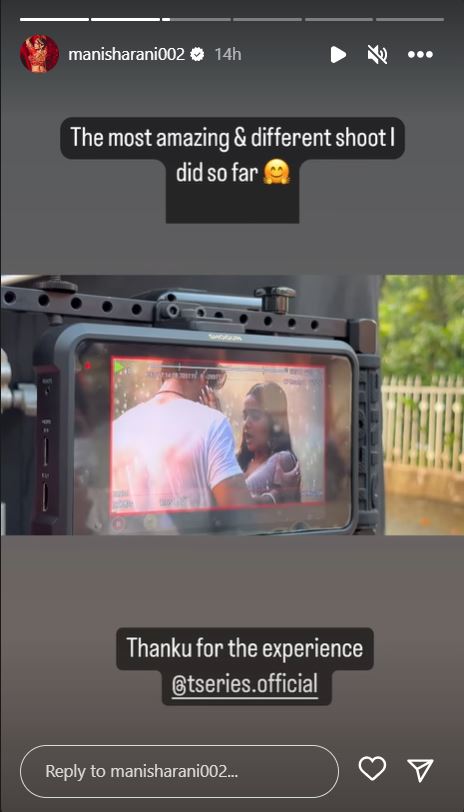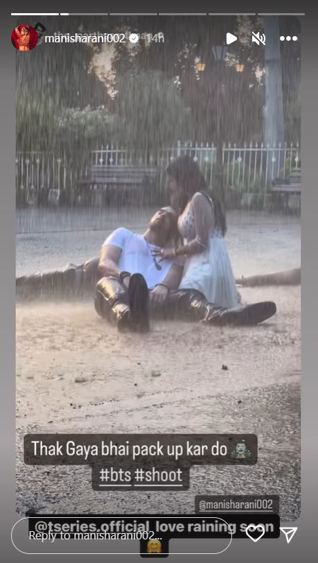 इस वीडियो में उनके साथ 'कसौटी जिंदगी की-2' एक्टर पार्थ समथान नजर आ रहे हैं, जो मनीषा की गोद में सिर रखकर लेटे हैं। वीडियो में साफ देखा जा सकता है कि बारिश में ये गाना शूट हुआ है, जिसके बाद फैंस ये अंदाजा लगा रहे हैं कि ये गाना एक रोमांटिक ट्रैक होगा। इस वीडियो को शेयर करते हुए मनीषा रानी ने कैप्शन में लिखा, "थक गया भाई, पैकअप कर दो"।