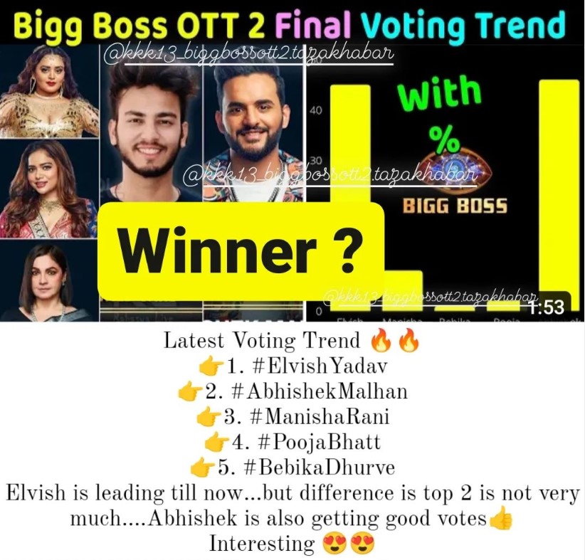 Bigg Boss OTT 2 रियलिटी शो बिग बॉस ओटीटी 2 खत्म होने वाला है। पूजा भट्ट एल्विश यादव अभिषेक मल्हान मनीषा रानी और बेबिका ध्रुवे में ट्रॉफी जीतने को लेकर तगड़ी टक्कर होते देखने को मिल रही है। सभी ने शुरुआत से लेकर अब तक टास्क में अपनी बेस्ट परफॉर्मेंस दी है। सोशल मीडिया पर दो-तीन कंटेस्टेंट्स के बीच कड़ा मुकाबला होते देखने को मिल रहा है।