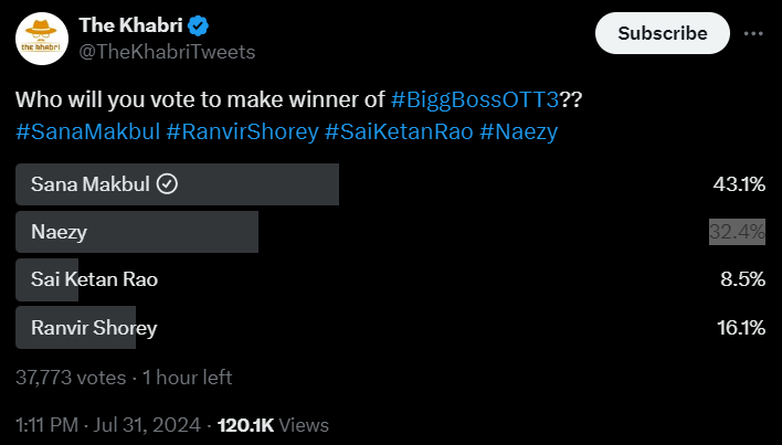 द खबरी ने अपने एक्स अकाउंट पर सोशल मीडिया की वोटिंग लिस्ट शेयर की है, जिसमें सना मकबूल को तकरीबन 43 पर्सेंट वोट्स मिले हैं, इसके अलावा दूसरे नंबर पर नेजी हैं जिन्हें 32.4% पर्सेंट वोट्स मिले हैं। तीसरे नंबर पर सोशल मीडिया वोटिंग लिस्ट में रणवीर शौरी (Ranvir Shorey) हैं, जिन्हें 16% वोट्स मिले और चौथे नंबर पर साई केतन राव हैं। इस लिस्ट में सबसे पीछे अरमान मलिक की दूसरी पत्नी कृतिका मलिक हैं।