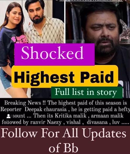 दीपक चौरसिया के बाद सबसे ज्यादा फीस कृतिका मलिक, फिर उनके पति अरमान, रणवीर शौरी, नाएजी, विशाल, सना मकबूल और लव कटारिया को मिल रही है। फिलहाल, मेकर्स की तरफ से इसकी आधिकारिक घोषणा नहीं की गई है। हम इसकी पुष्टि नहीं करते हैं।