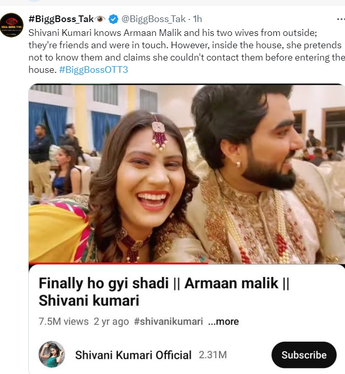 बिग बॉस से जुड़ी खबरें शेयर करने वाले पेज बिग बॉस तक ने जानकारी दी कि शिवानी कुमारी पहले से अरमान मलिक और उनकी दोनों पत्नियों को जानती हैं। हालांकि, घर के अंदर वो दिखावा कर रही हैं, वो उन्हें जानती और शो में आने से पहले कॉन्टैक्ट भी नहीं किया था।